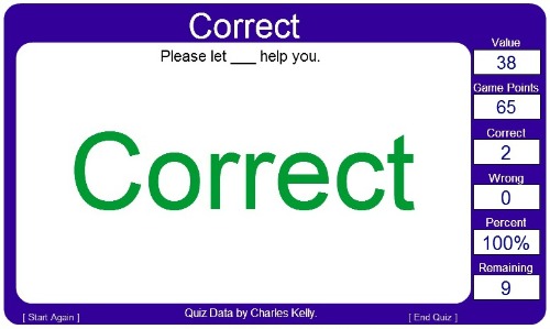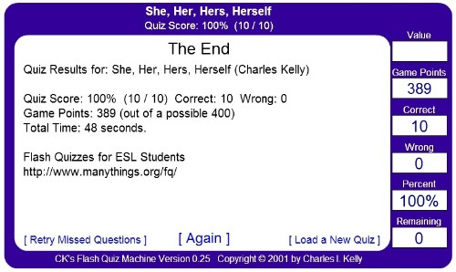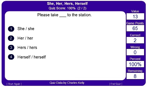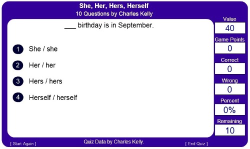 Game of the Week ~ Surprise, Surprise!Hang on in there, my friends, as it’s Quiz time! today… For a change, I shall challenge you to a little test this time, which is nicely put in the format of a game online. Do this, until you get the pronouns ‘she’, ‘her’, ‘hers’ and ‘herself’ well into your system. If you understand how this works, then you will also know how to deal with ‘he’, ‘his’, ‘his’ and ‘himself’ and others like this. In this Quiz, you will have a sentence at the top, missing one word, and then the selection of ‘she’, ‘her’, ‘hers’ and ‘herself’ pronouns underneath, for you to choose the correct form. You can just click on it, or you may want to learn the following codes, for you to use your keypad instead.