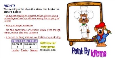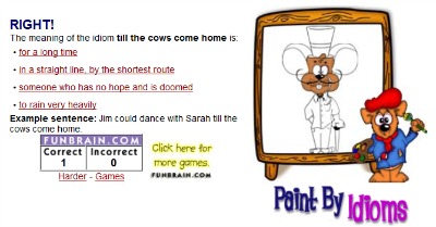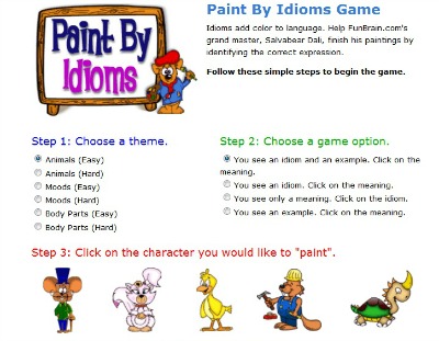 Hello,Greetings and General InformationA warm welcome to our new subscribers! I wish you will find My English Club fun and instructive and I look forward to welcome you as a new valued member soon. Read, learn and communicate around the world! Please feel free to contribute to these pages when you have a minute. They are meant to be a platform for exchanging ideas, stories and opinions - an ideal medium for practicing your English, which should be used to the full. Together, let's bring it alive, let's make it the welcoming community you wished for, when you joined. Use the Comments facility at the end of every page and start making friends worldwide. You and your friends can always subscribe individually through the form on My English Club . If anybody mentions to you that they are interested in receiving it, please tell them this, with thanks. Of course, you can also unsubscribe at any point, by using the link at the end of any issue of the e-zine, should you wish - no questions asked. Until I'll have the time to write my e-books from these courses, you can enjoy our past lessons for free, as follows: Grammar ~ Expressing AdditionPlease find this topic outlined on the Expressing Addition page. This is not about your standard math addition - none of that here. This will teach you how to add a topic to your conversation and another person to your subject. I hope you find it useful in your English practice. Writing ~ Adjectives as ModifiersAs we mentioned in our last lesson, writers also need to pay strict attention to their adjectives in a sentence and we touched on the order of adjectives, to start with. Today I prepared a lesson about the modifying aspect of adjectives, giving you hints about how to use this effectively for writing purposes. Find it on the Adjectives as Modifiers page. I suggest you should study this topic even if you're not planning to become a writer, but you are merely going to take a test with a writing component. Game of the Week ~ Paint by IdiomsSince I still haven't heard from any of you about this topic so far, I think it's better to continue with our Weekly Game section, since some people subscribe to the e-zine especially for this. In parallel, I shall deal with my idea of using English for work in its own space on the website and those interested will communicate with me from there. This brings us to the game I prepared for you today: Paint by Idioms , which is a vocabulary game for beginners up to advanced students. You will need to pick out the correct meaning of the idiom given, from a choice of four possible answers.