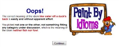 You get an 'Oops! and the correct meaning and usage of the respective idiom. This is useful, as you do wish to learn while playing. You carry on, with your 'Oops!-es' showing in the score box on each page.