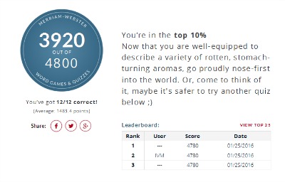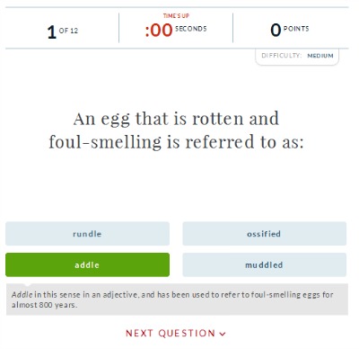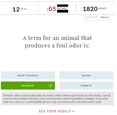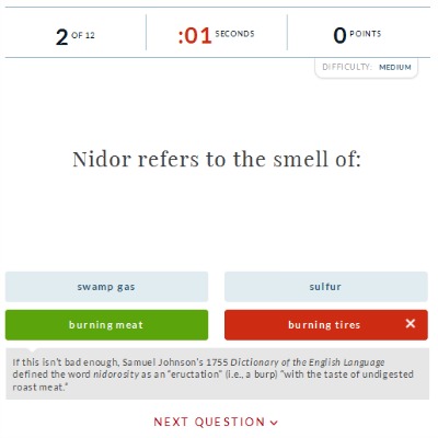 You will have 12 questions and exactly 10 seconds before your time runs out in each case, so be alert when you sit down to play this game, he, he... Once you've made the correct choice, that word will turn green, which is your confirmation you're right. Additionally, you'll get some extra information about the word - you may be surprised to learn this in certain cases.